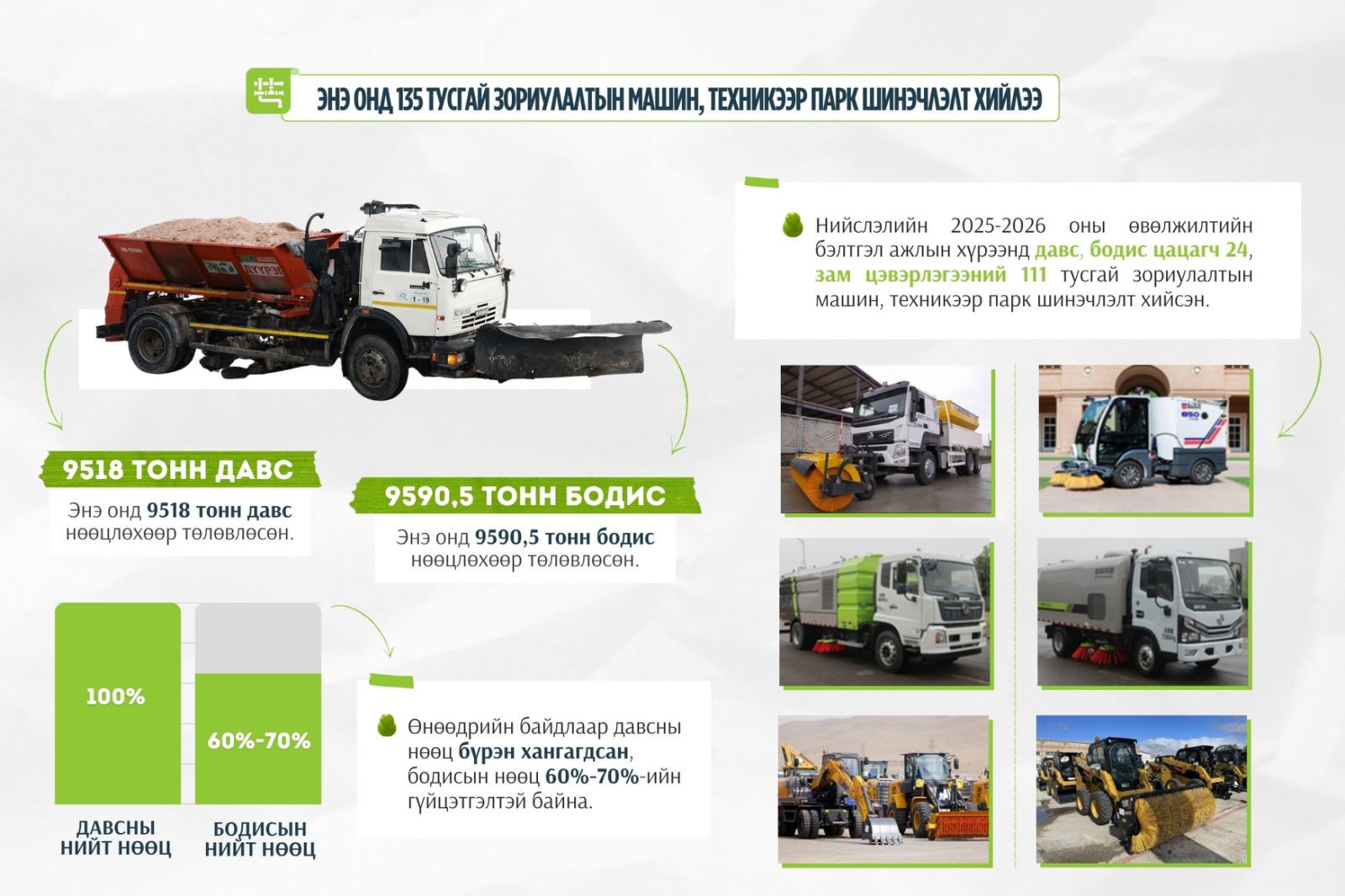 Тэрбээр “Нийслэлийн хэмжээнд “Бид өвөлд бэлэн үү” аяныг зохион байгуулж, 48 ТҮК-ийн техник хэрэгсэл, давс, бодисын нөөцийн байдлыг газар дээр нь шалган ажилласан. Дүүргүүдийн өвөлжилтийн бэлэн байдал 95-98 хувийн гүйцэтгэлтэй байна. Нийслэлийн хэмжээнд зам талбайн цэвэрлэгээ, халтиргаа гулгаанаас сэргийлэх зориулалттай тусгай техник хэрэгслийг нэмэгдүүллээ. Тодруулбал, энэ онд давс, бодис цацагч 24, зам цэвэрлэгээний 111 тусгай зориулалтын машин, техникээр парк шинэчлэлт хийсэн. Өнгөрсөн оны хувьд 3075 тонн давс, 1000 орчим тонн бодисоор өвлийг давж байсан бол энэ онд дунджаар тав дахин их нөөцтэй буюу 9518 тонн давс, 9590 тонн бодисыг нөөцлөхөөр төлөвлөж буй. Өнөөдрийн байдлаар давсны нөөц бүрэн хангагдсан, бодисын нөөц 60-70 хувийн гүйцэтгэлтэй байна” гэлээ.