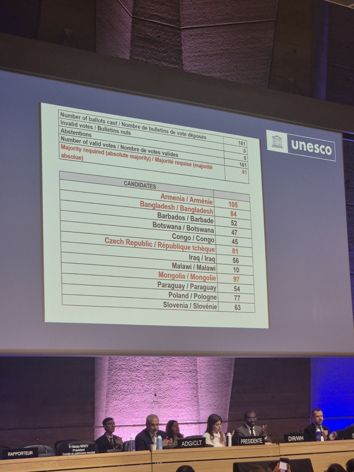 Тус сонгуульд нээлттэй таван суудлын төлөө 12 улс өрсөлдсөн бөгөөд манай улс Армени, Бангладеш, Чех, Польш Улстай хамт тус хорооны гишүүнээр ажиллахаар болов.