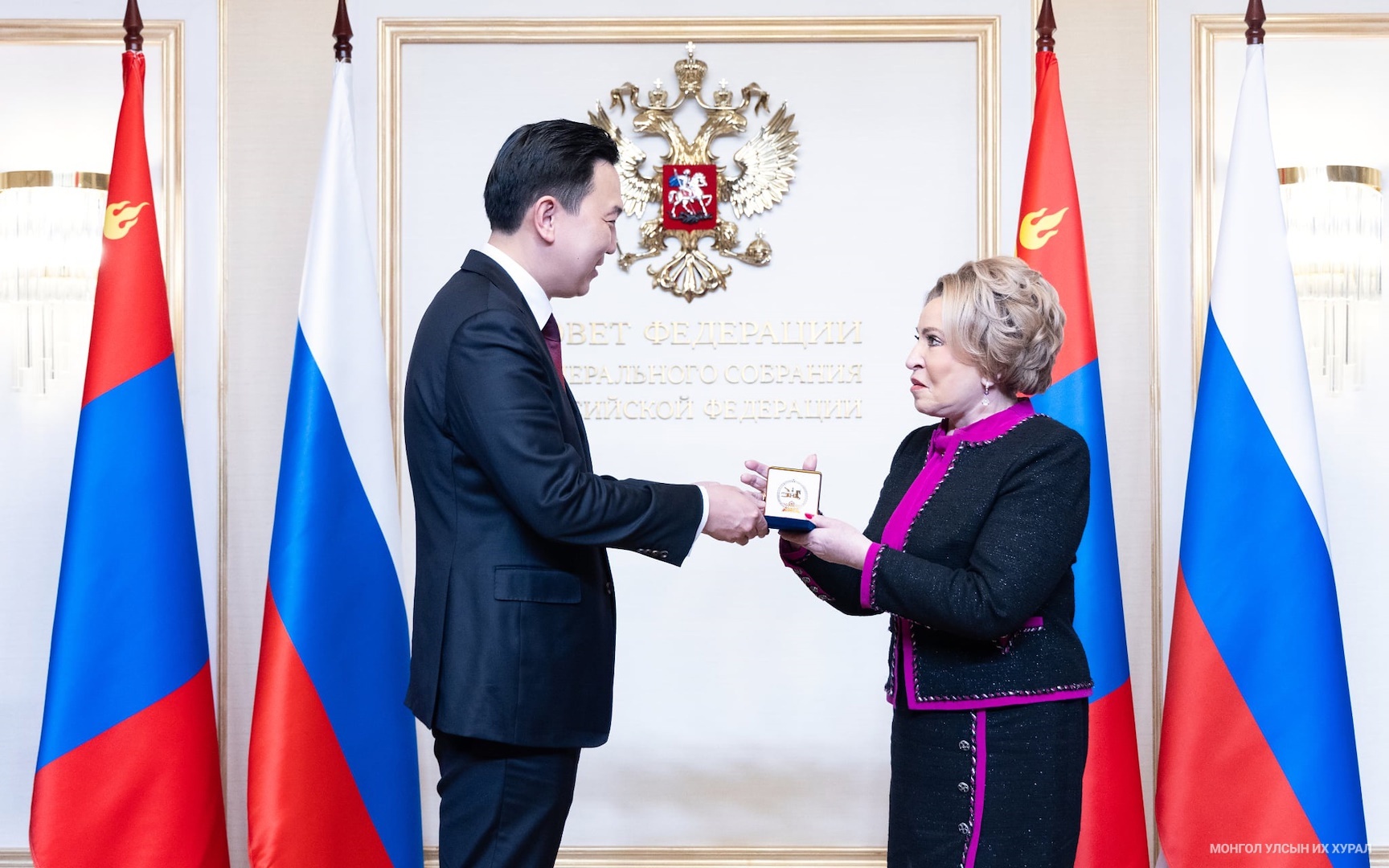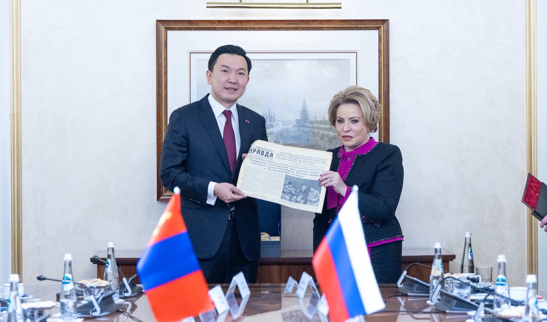 ОХУ-ын Холбооны Хурлын Холбооны Зөвлөлийн дарга В.И.Матвиенко Монгол Улс нь ОХУ-ын Ази, Номхон далайн бүс нутаг дахь чухал түнш бөгөөд хоёр орны найрсаг харилцаа, хамтын ажиллагааны өнө эртний уламжлалыг өргөжүүлэн хөгжүүлэхэд парламент хоорондын хэлхээ, холбоо чухал үүрэгтэйг тэмдэглэлээ. Тэрбээр, Улсын Их Хурлын дарга Н.Учрал “Монгол Улсын тусгаар тогтнол, бүрэн эрхт байдлын төлөөх тэмцэл: 1924-1945 он” сэдвээр докторын зэргээ хамгаалсныг дурдаад өдгөөгөөс 81 жилийн өмнө Монгол Улсын тусгаар тогтнолыг олон улсад баталгаажуулсан Ялтын гэрээг баталсан түүхт энэ өдөр уулзаж байгаагаа бэлэгшээж байгаагаа тэмдэглэв. Иймд “Их Засаг” сургуулийн үүдэнд баримал болон баригдсан “Гитлерийн Германы эсрэг эвсэл” буюу Рузвельт, Черчилль, Сталин нарын зургийг харуулсан 1945 оны “Правда” сонины эх хувийг дурсгав.