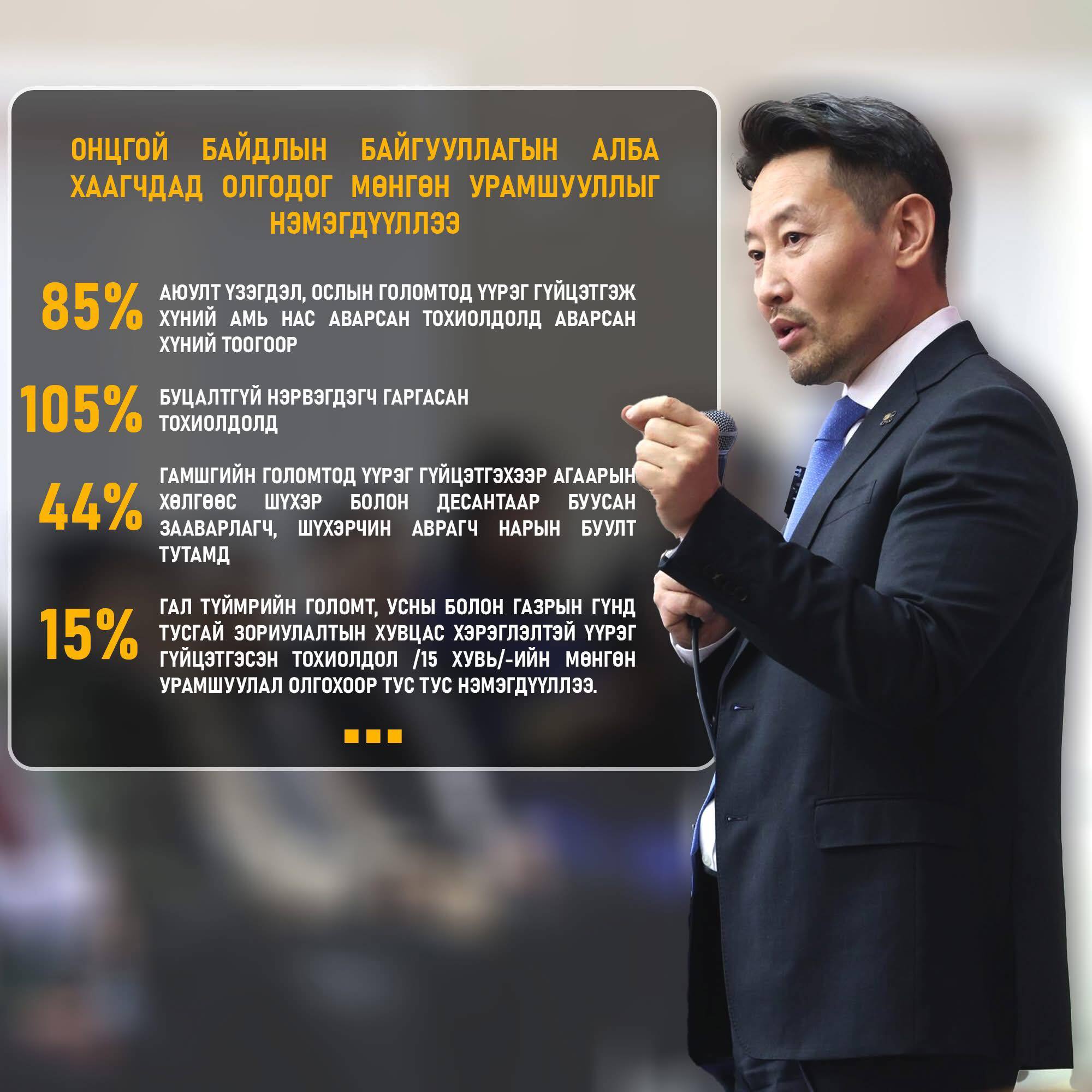 - Гал түймрийн голомт, усны болон газрын гүнд тусгай зориулалтын хувцас хэрэглэлтэй үүрэг гүйцэтгэсэн тохиолдол /15 хувь/-ийн мөнгөн урамшуулал олгохоор тус тус тусгасан.