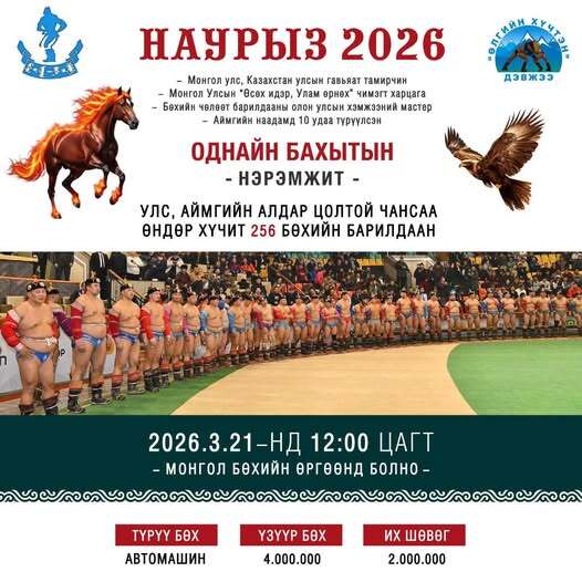 Монгол улс, Казакстан улсын гавьяат тамирчин, бөхийн чөлөөт барилдааны Олон Улсын хэмжээний мастер, Баян-Өлгий аймгийнхаа баяр наадамд 10 удаа түрүүлсэн, Монгол Улсын харцага Однайн Бахытын нэрэмжит "Наурыз 2026" улс аймгийн цолтой 256 бөхийн барилдаан гуравдугаар сарын 21-ний Бямба гарагийн 12:00 цагт Монгол Бөхийн Өргөөнд болно.