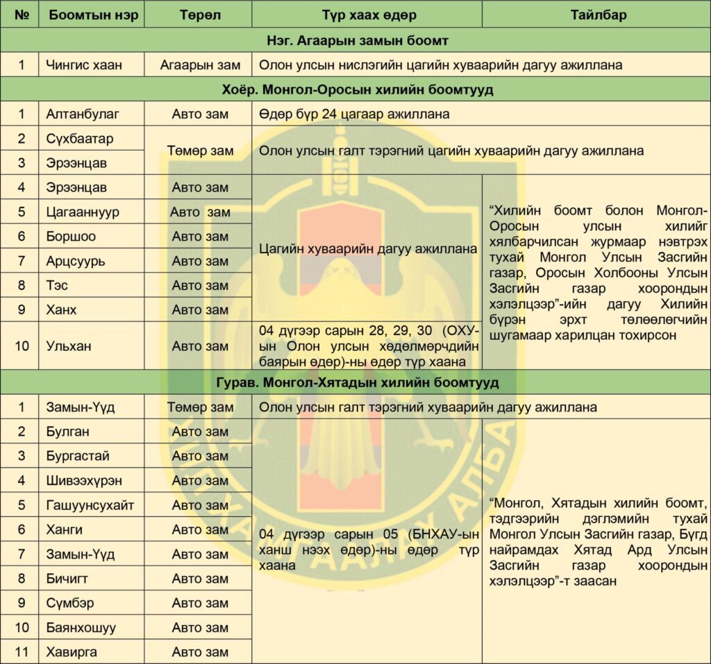 - Булган, Бургастай, Шивээхүрэн, Гашуунсухайт, Ханги, Замын-Үүд (авто), Бичигт, Сүмбэр, Баянхошуу, Хавирга зэрэг авто замын боомтууд Дөрөвдүгээр сарын 5-нд (БНХАУ-ын ханш нээх өдөр) түр хаана.