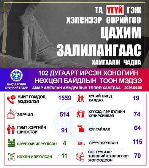 Цагдаагийн байгууллагын 102 тусгай дугаарт 2026 оны 04 дүгээр сарын 05-ны өдөр нийт 1559 дуудлага, мэдээлэл бүртгэгдсэнээс зөрчлийн шинжтэй 514, гэмт хэргийн шинжтэй 91 дуудлага, мэдээлэл байна.