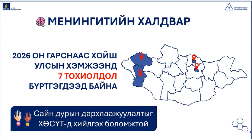 Монгол Улсын хэмжээнд 2026 оны 4 дүгээр сарын 06-ны өдрийн байдлаар менингококкт халдварын батлагдсан 7 тохиолдол (УБ-3, ДА-1, ХО-2, УВ-1), 3 нас баралт бүртгэгдлээ.