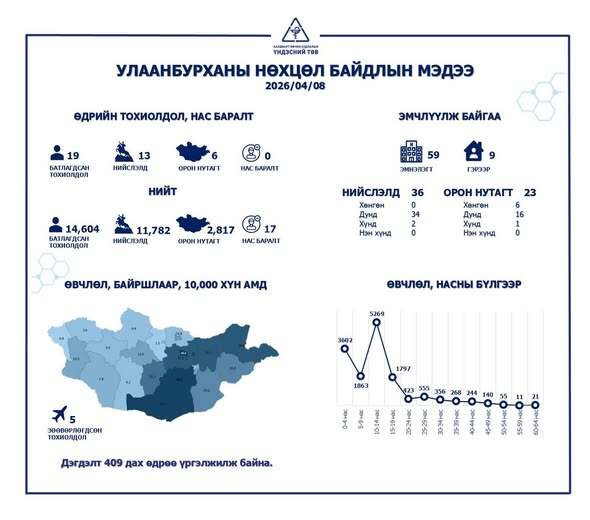 Улаанбурхан өвчний шинэ тохиолдол өнгөрсөн 24 цагт 19 бүртгэгдлээ. Үүнээс нийслэлд 13, орон нутагт 6 байна.