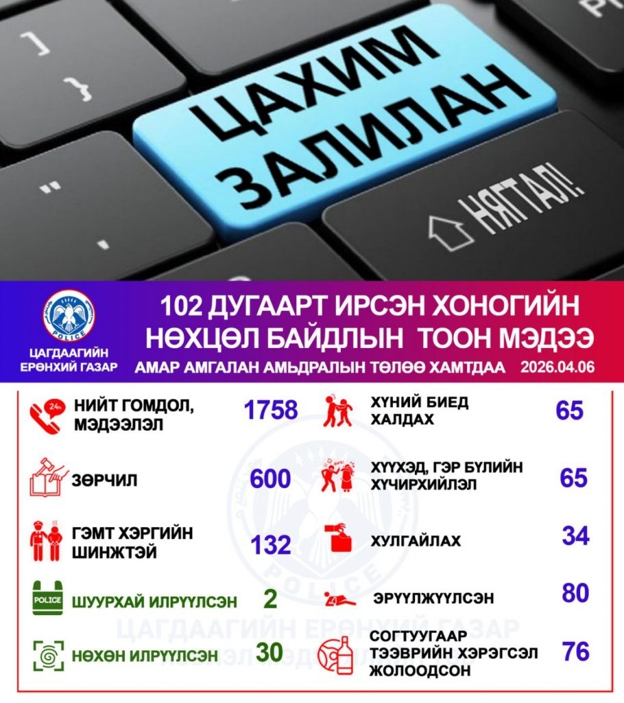 Цагдаагийн байгууллагын 102 тусгай дугаарт энэ сарын 06-ны өдөр нийт 1758 дуудлага иржээ. Ирсэн дуудлага мэдээлэлд зөрчлийн шинжтэй 600, гэмт хэргийн шинжтэй 132 дуудлага мэдээлэл ирсэн байна. Согтуугаар тээврийн хэрэгсэл жолоодсон 76 зөрчил бүртгэгджээ