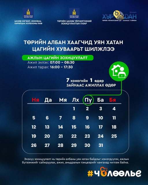 Монгол Улсын Засгийн газрын 2026 оны дөрөвдүгээр сарын 8-ны өдрийн ээлжит хуралдаанаар төрийн албан хаагчдын ажлын зохион байгуулалтыг уян хатан болгох, ажлын бүтээмжийг нэмэгдүүлэх зорилгоор цагийн хуваарьт өөрчлөлт оруулах, мөн зайнаас ажиллах нөхцөлийг бүрдүүлэх шийдвэрийг гаргасан.